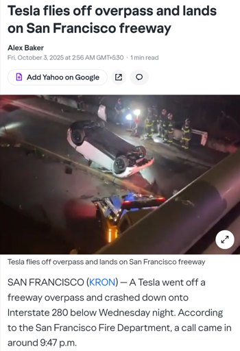 arrow-up157arrow-down1external-linkTesla In 'Self-Drive Mode' Hit By Train After Turning Onto Train Tracks and Parkingplus-squarewww.jalopnik.comseaplant@slrpnk.netEnglish · 5 months agomessage-square2linkfedilink
