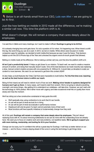arrow-up1385arrow-down1imageDuolingo is going AI-firstlemmy.worldslaacaa@lemmy.world to LinkedinLunatics@sh.itjust.works · edit-25 months agomessage-square70linkfedilink