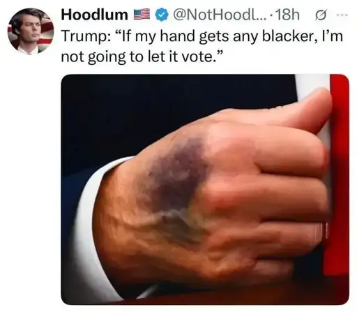 the only people with the balls to squeeze back in his handshake game are Putain, Musk, Whitmer, Newsom, Mills, maybe a third of the european leadership, Modi, Xi, KJU, any competent phlebotomist could give him different instructions or cath sizing to prevent bruising and i “wonder why” they don’t (or maybe he just ignores the instructions because he’s SO SMRT), you know what, i’m starting to think pretty much everyone is starting to squeeze back hard and he’s hurting his hand.