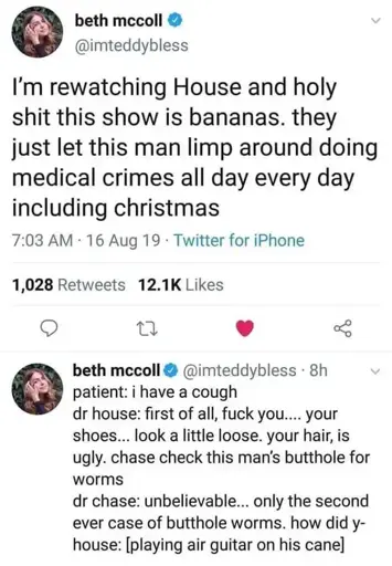 arrow-up11.05Karrow-down1imageAn accurate representation of House M.Dlemmy.dbzer0.comStamets@lemmy.dbzer0.com to People Twitter@sh.itjust.works · 29 days agomessage-square109linkfedilink