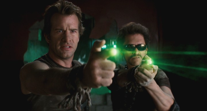 Image of two casually dressed guys pointing fingerguns at the camera, green beams are coming out of the fingerguns. The Vegan Police from the movie Scott Pilgrim vs. The World. The cops are played by Thomas Jane and Clifton Collins Jr, the latter is wearing sunglasses, while it is dark.