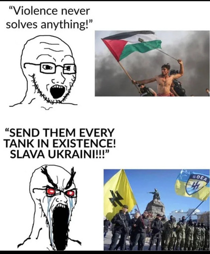 well…ukrainians are not exactly “white people” (at least for the nazis) it’s most likely “violence is never the answer…unless is against an enemy of the empire or left wing people”
