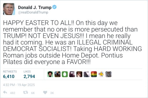 jubilationtcornpone@sh.itjust.works to Political Memes@lemmy.worldEnglish · 6 months agoHappy Easter from the POTUSsh.itjust.worksimagemessage-square13linkfedilinkarrow-up1197arrow-down111file-textcross-posted to: lemmyshitpost@lemmy.world