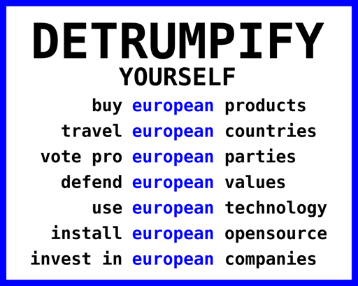 DETRUMPIFY YOURSELF Buy european products Travel european countries Vote pro european parties Defend european values Use european technology Use european opensource Invest in european companies