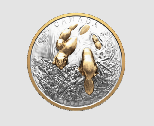 The reverse shows a birds-eye view of a family of beavers — an adult male and female, and their two kits — building a lodge. The obverse depicts what’s happening underwater out of our eyelines, showing the underbellies of the beavers and their lodge.