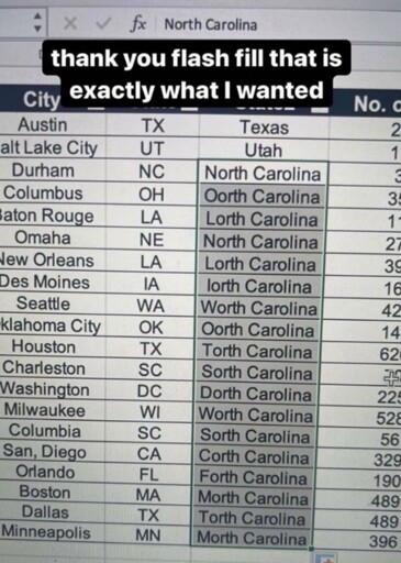 Flash fill is not the result of user dragging. It’s an automatic prediction done by Excel while you type. Therefore, the commonly horrible output is not the result of user error.