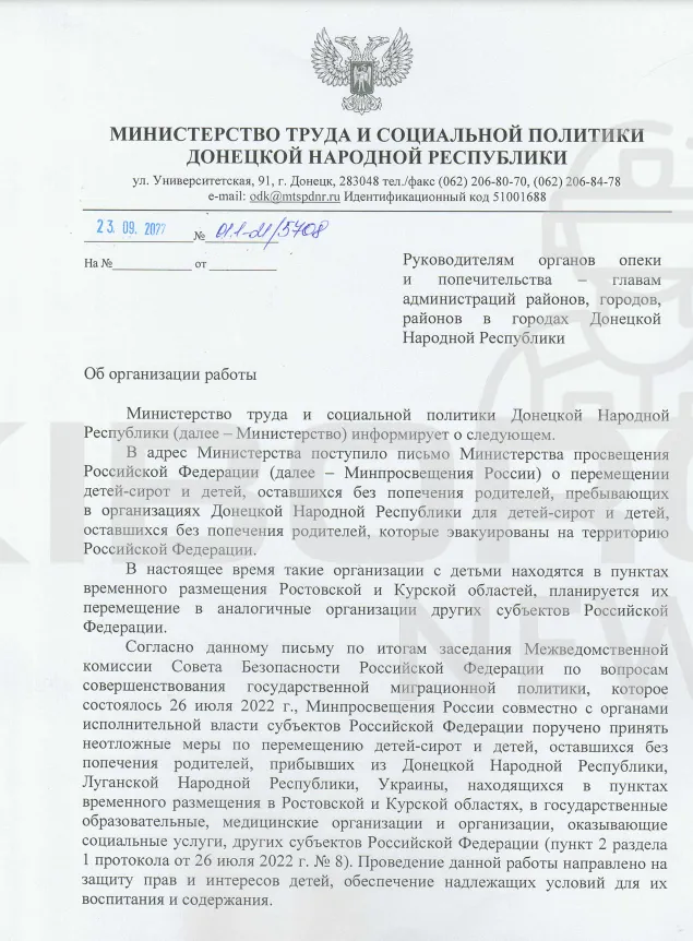 Nel settembre 2022, il Ministero del Lavoro e delle Politiche Sociali della regione occupata di Donetsk ha notificato ai capi delle autorità di tutela lo spostamento dei bambini dai territori occupati in un documento firmato dal ministro ad interim Larisa Tolstikina.